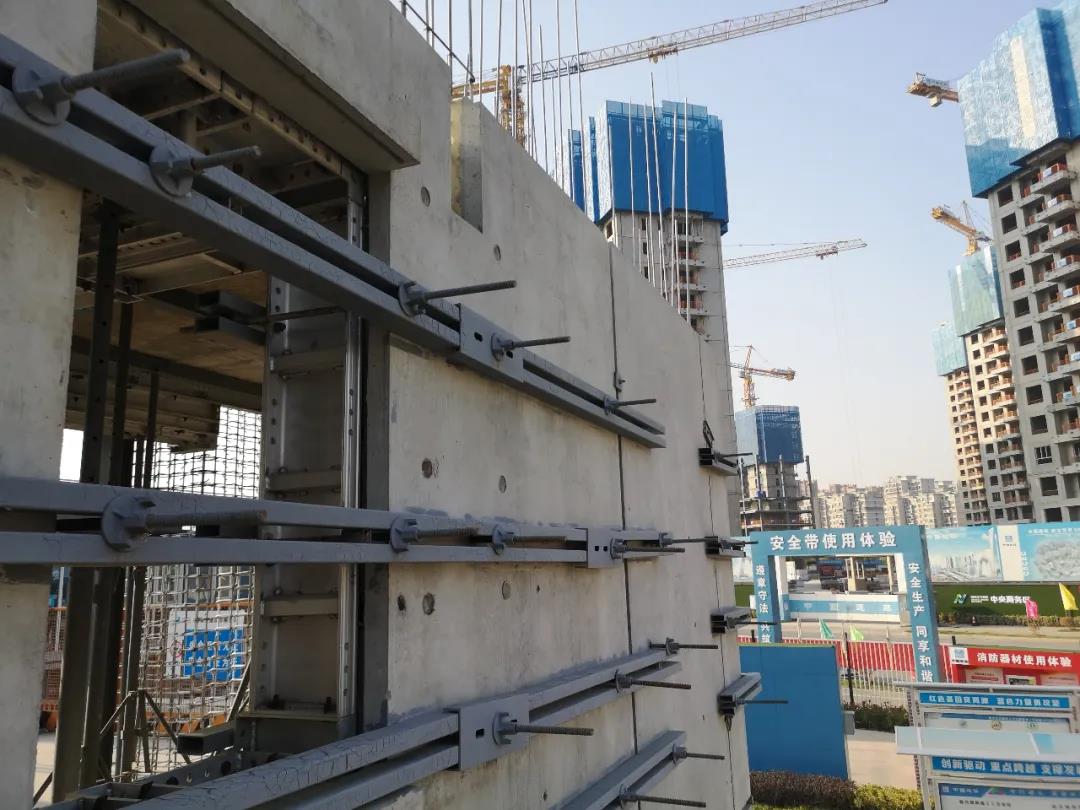 上海顧村某安置房項(xiàng)目(圖5),外立面為預(yù)制構(gòu)件+后澆暗柱,有后澆混凝土暗柱;使用了免外架方案——外掛架(圖6)