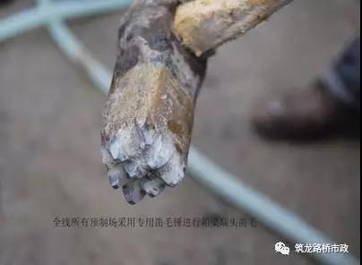 混凝土端面鑿毛凡是濕接縫、梁端等部位,拆模后立即用專用鑿錘或電動鑿毛錘進行鑿毛。